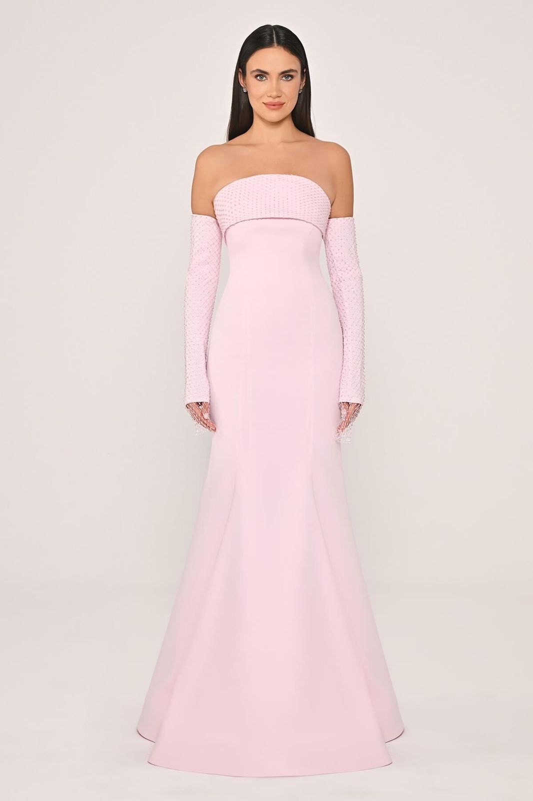 فستان أزرق سماوي أنيق بدون أكمام، يأتي مع أكمام منفصلة مغطاة بالكامل بتطريز ناعم يضيف لمسة أنثوية حالمة. الصدر مكشوف بشكل أنيق ومتين، بينما ينسدل الفستان بشكل انسيابي حتى الأرض بقصة ذيل السمكة التي تبرز القوام بطريقة أنثوية ساحرة. خيار مثالي لإطلالة فخمة في حفلات الخطوبة أو المناسبات المسائية الفاخرة.