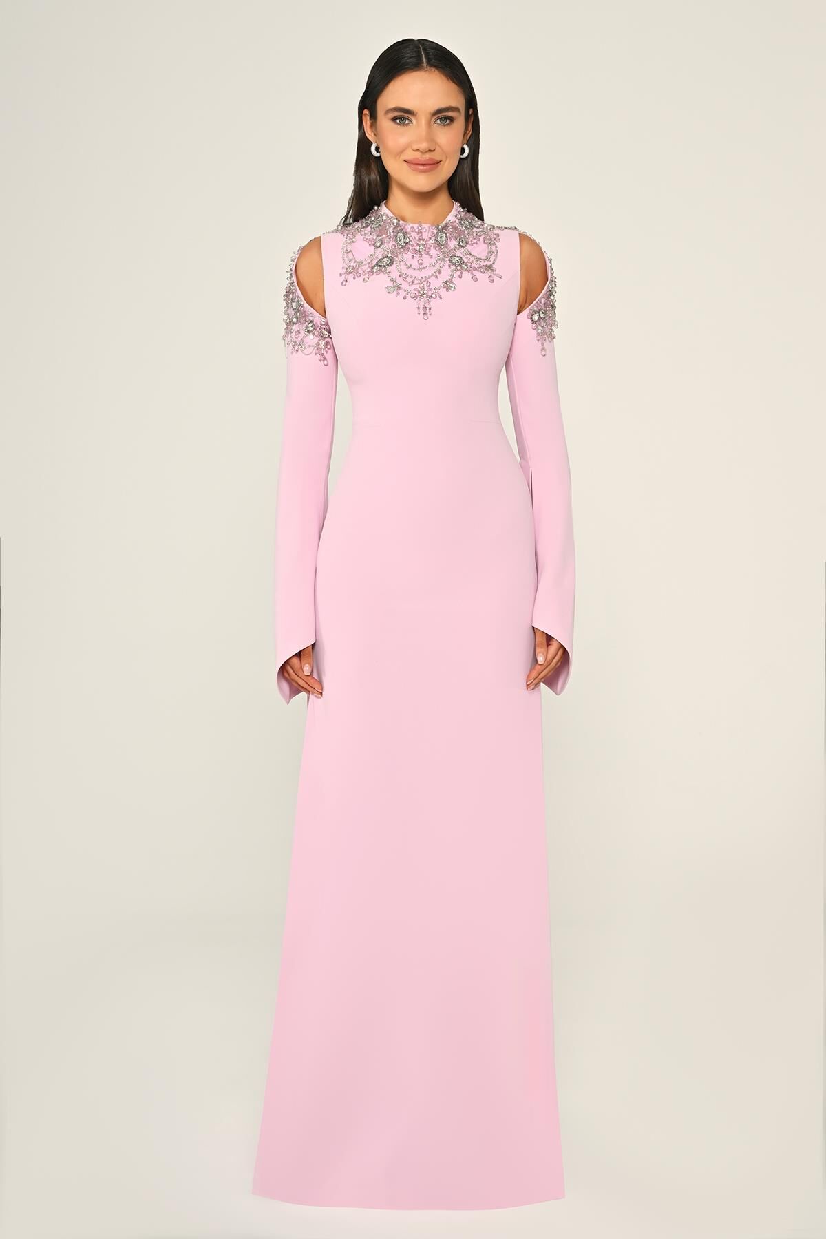 فستان بقصة انسيابية راقية باللون الأزرق السماوي، مزين بتطريز فاخر على الكتفين والصدر مع فتحات كتف أنيقة، وأكمام طويلة بوسع ملكي يمنح حضورًا فخمًا ومميّزًا