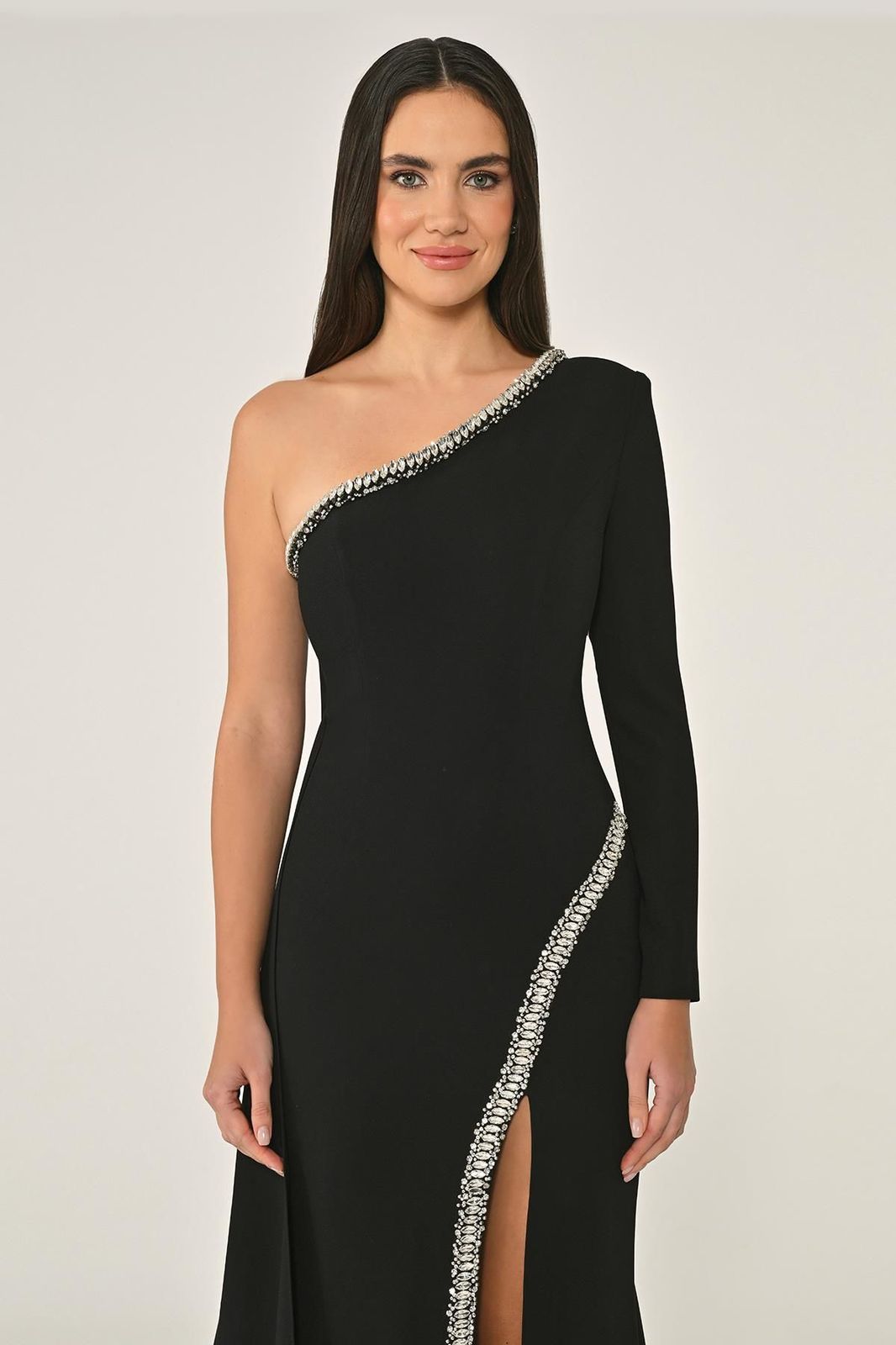 هذا الفستان الأسود الطويل بتصميم الكتف الواحد هو أيقونة من الأناقة، مع شق جانبي جريء مغطى بحواف كريستالية لامعة تنساب بانسيابية. يناسب المناسبات الرفيعة مثل حفلات الزفاف الرسمية أو حفلات الاستقبال الفاخرة.