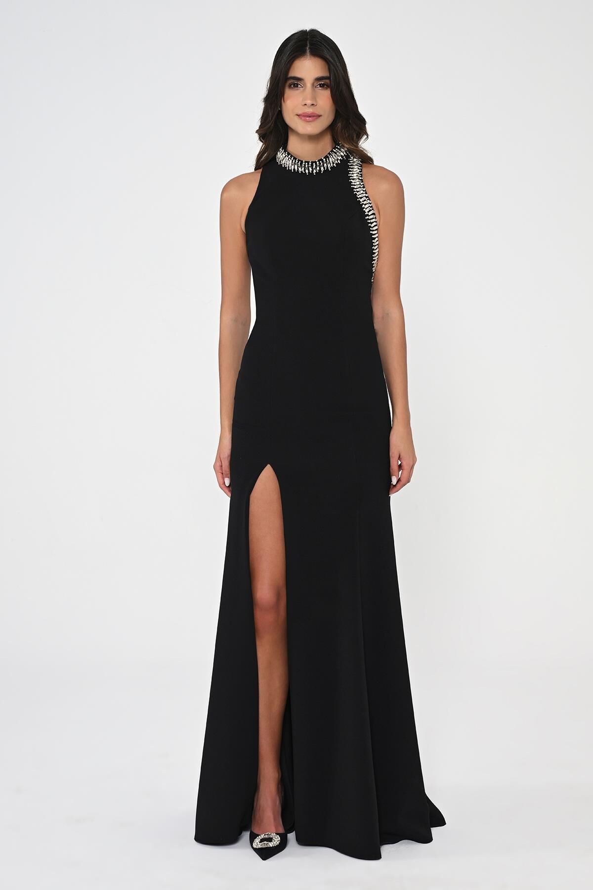 فستان أسود طويل بقصة ضيقة أنيقة مع فتحة أمامية عالية تكشف الساق. يميزه تصميم الرقبة المغلقة المزينة بحلية كريستالية فضية تمتد بشكل مائل على الصدر والكتف لإطلالة فاخرة.