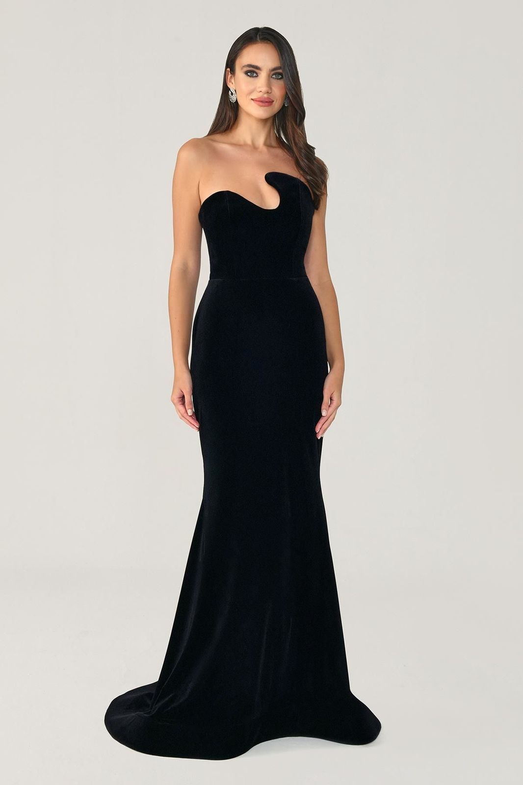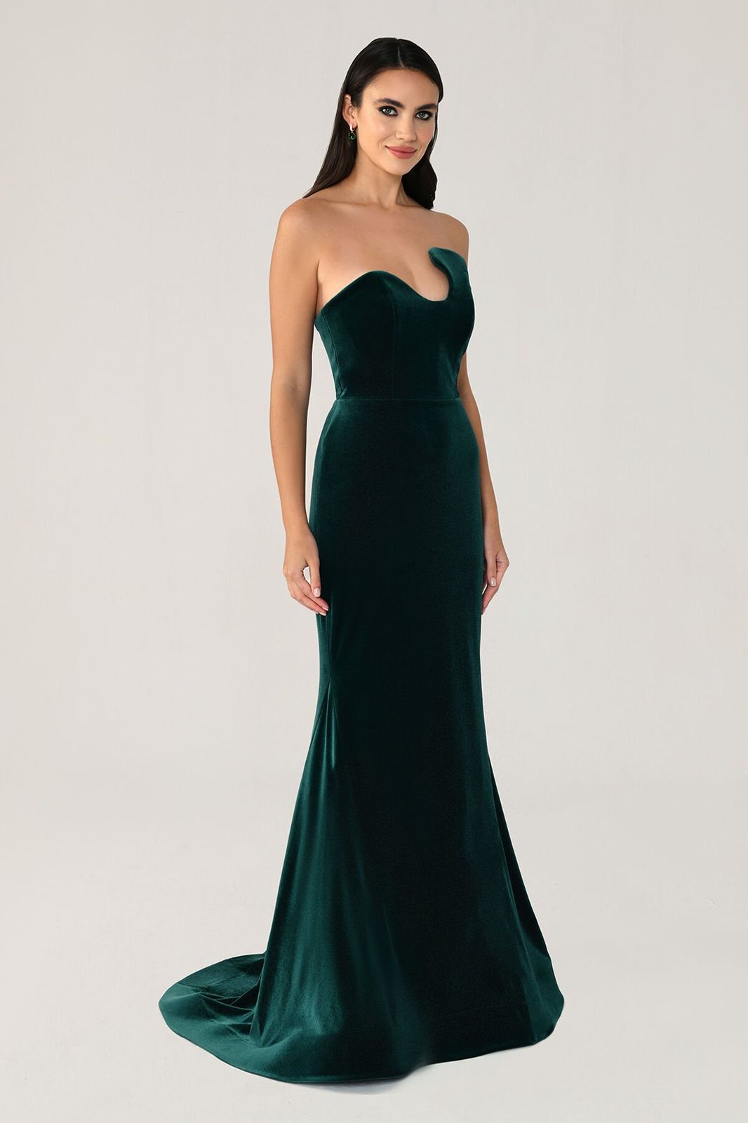 مصمم بقماش مخملي فاخر باللون الأخضر الزمردي، يعكس هذا الفستان إحساساً ملكياً. القصة العلوية بشكل قلب تضيف لمسة رومانسية ناعمة، في حين أن القصة الانسيابية تمنحك حضوراً آسراً. مناسب لحفلات الخطوبة أو المناسبات المسائية الفاخرة.