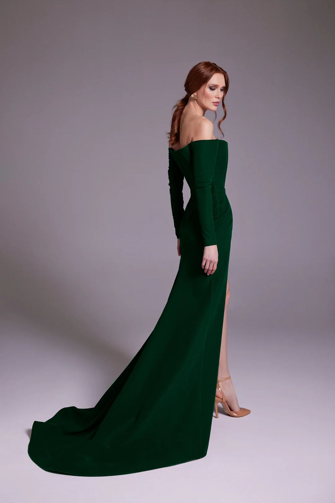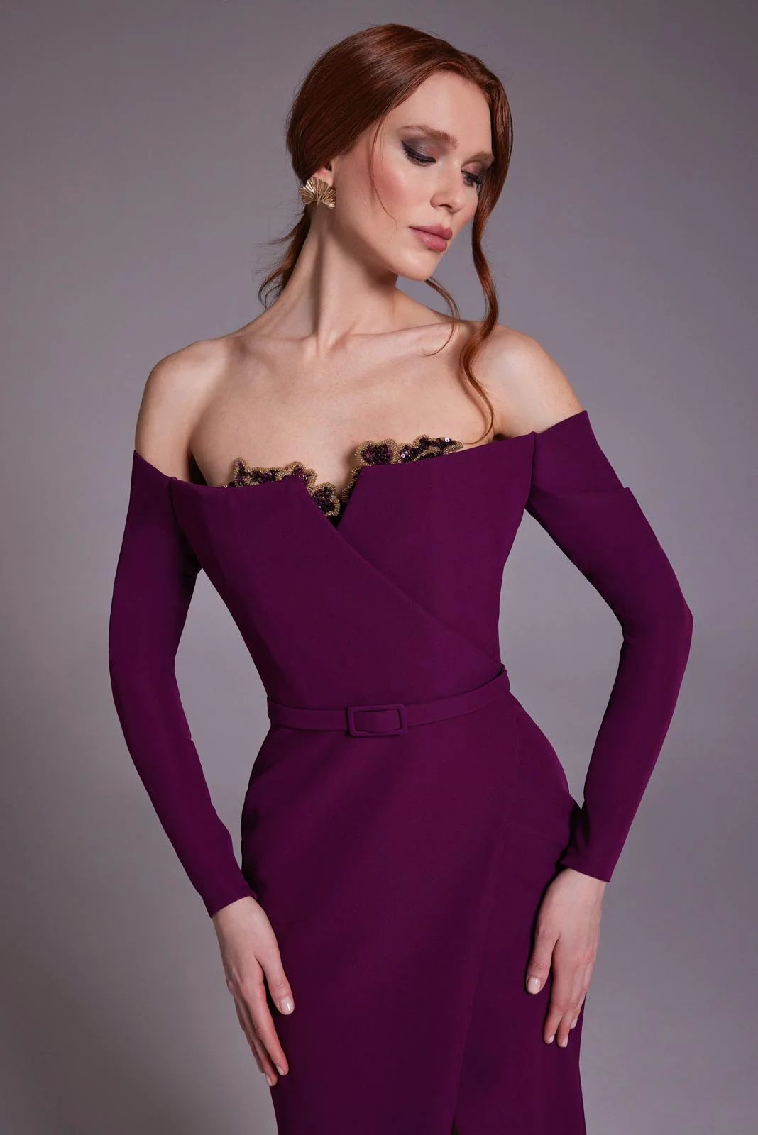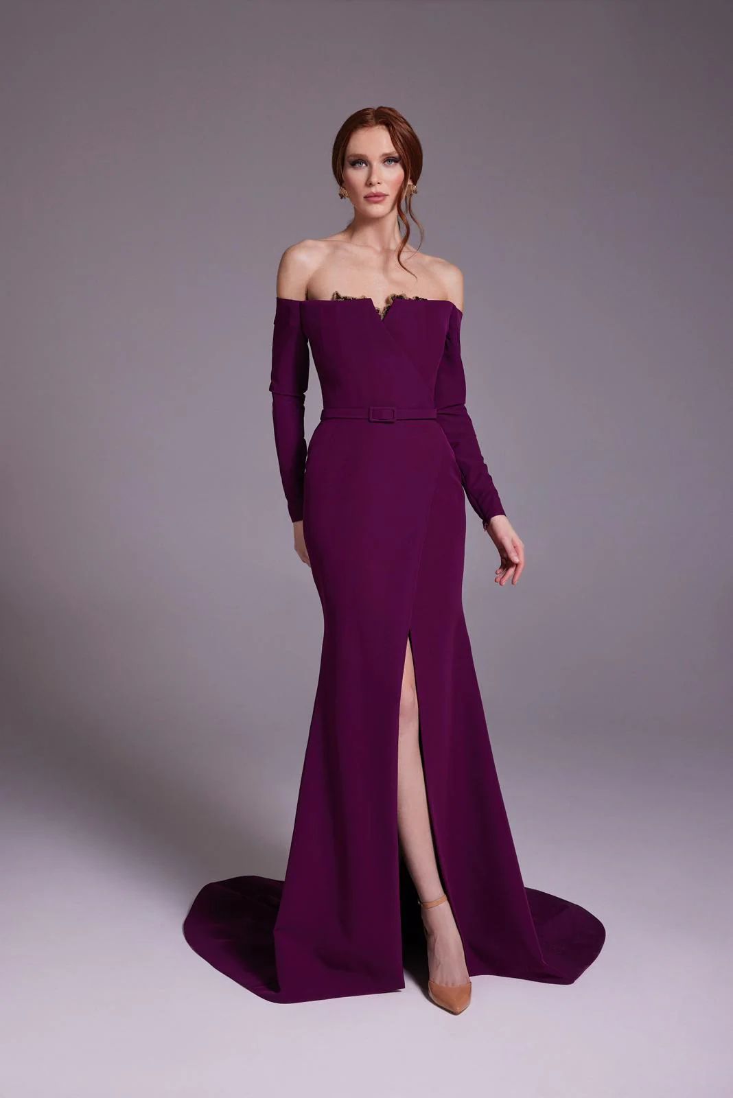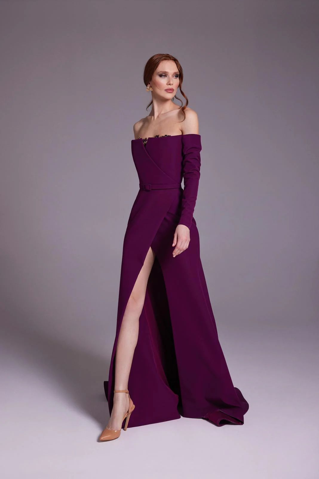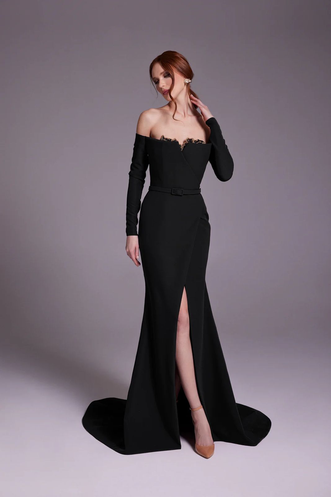 قماش الكريبقطع بدون حمالاتبدون أكتافمع 2 كم طويلتنورة رومانية كلاسيكية بفتحةمع حزاممشدات فائقة الوضعزخارف على الصدر