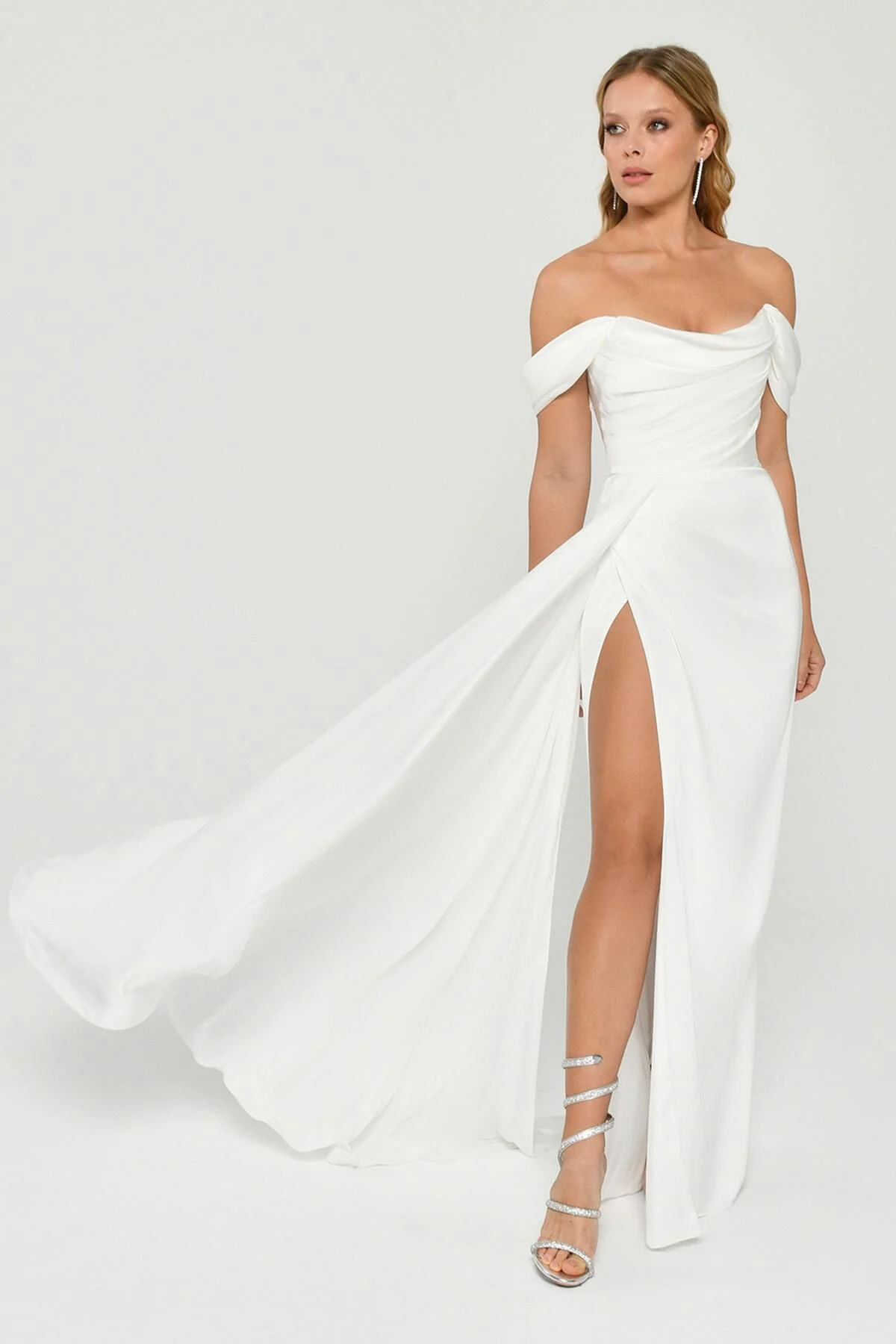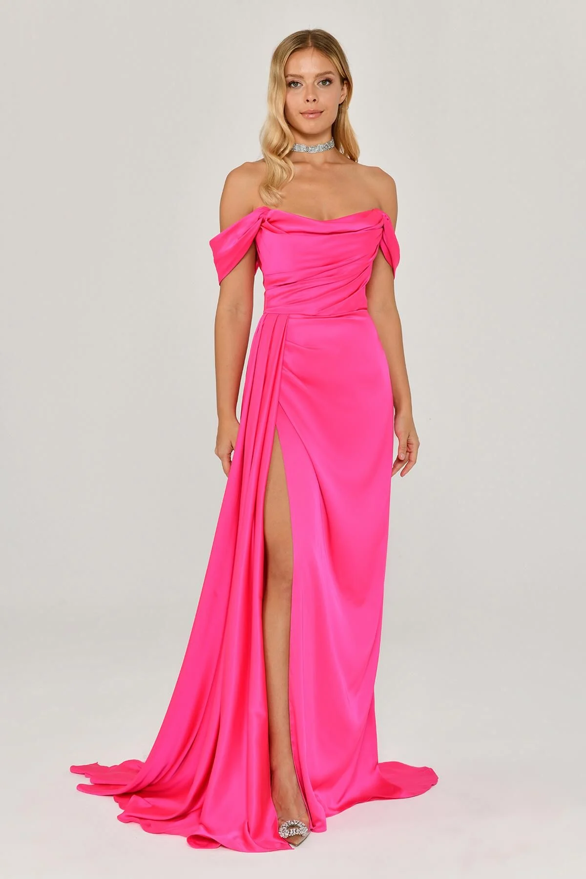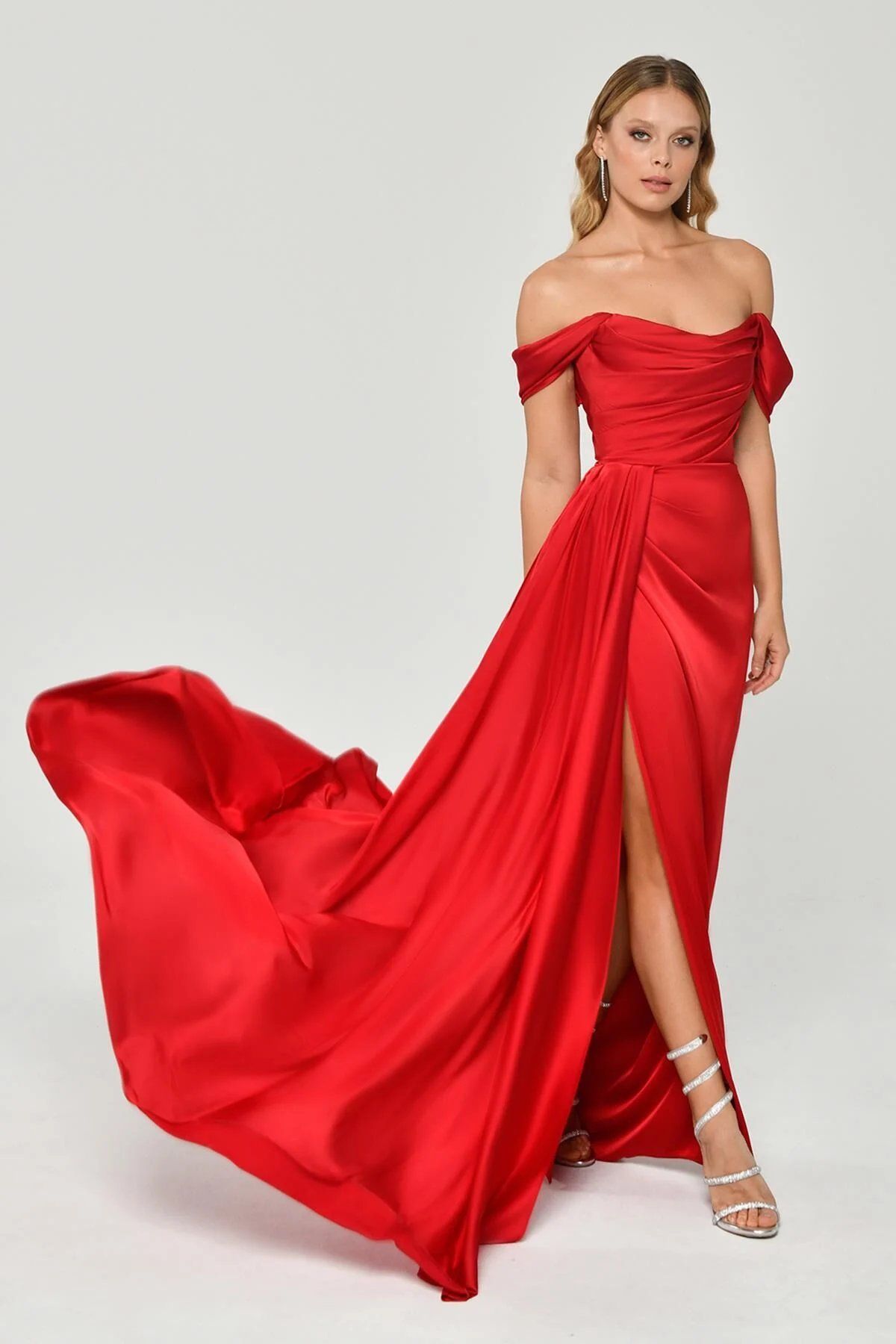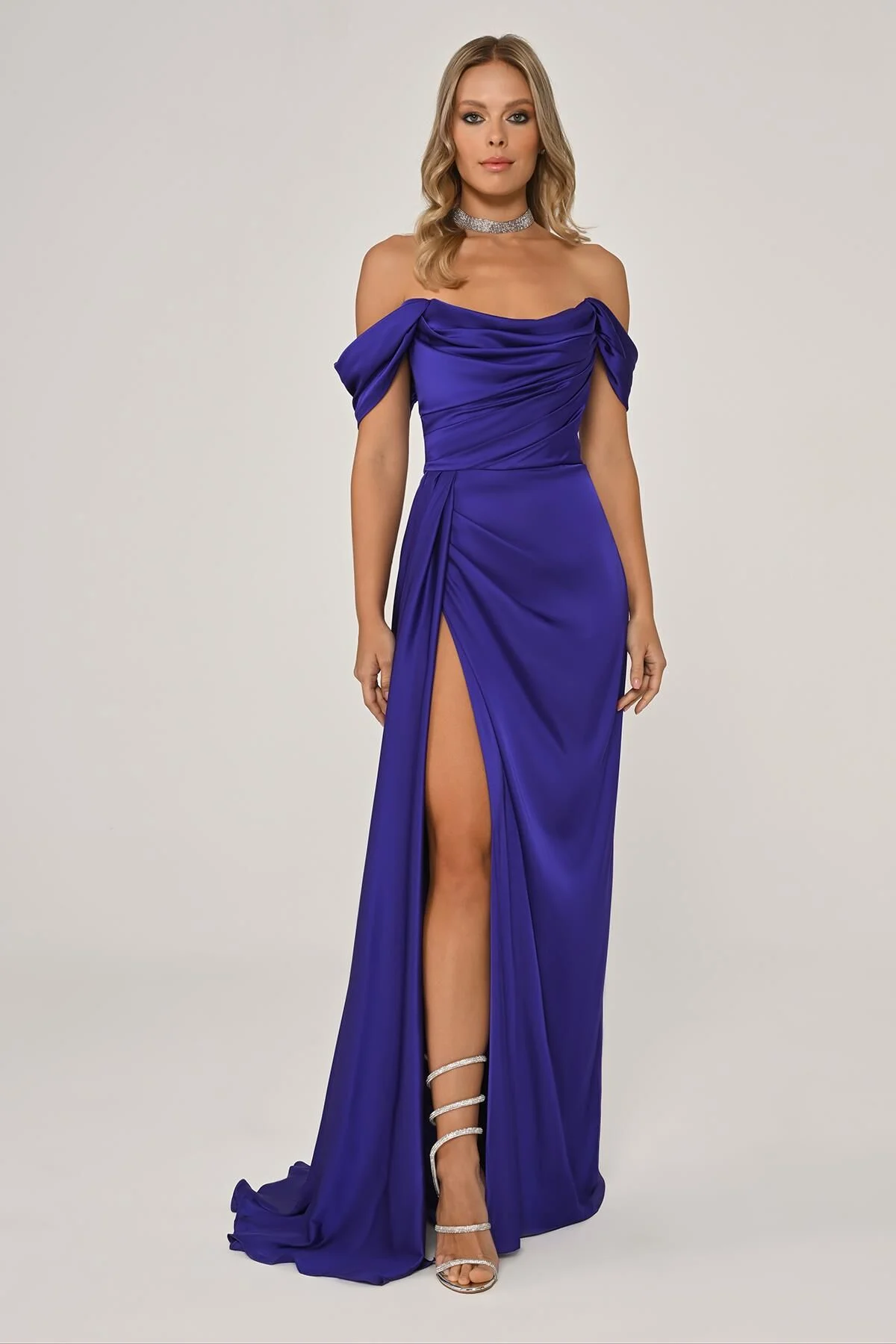 فستان ساتان طويل مكشوف الكتفين بفتحة جانبية. 5649